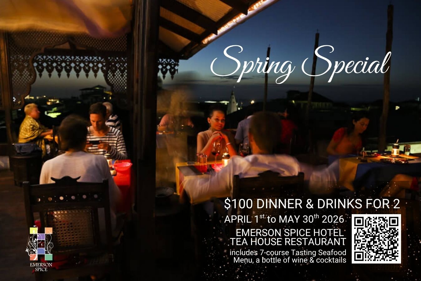 From the 1st April until the 30th May, Emerson Spice Tea House Restaurant is offering Two Seven Course Fish & Seafood tasting menus, two sunset cocktails, and a bottle of wine, for only $100.